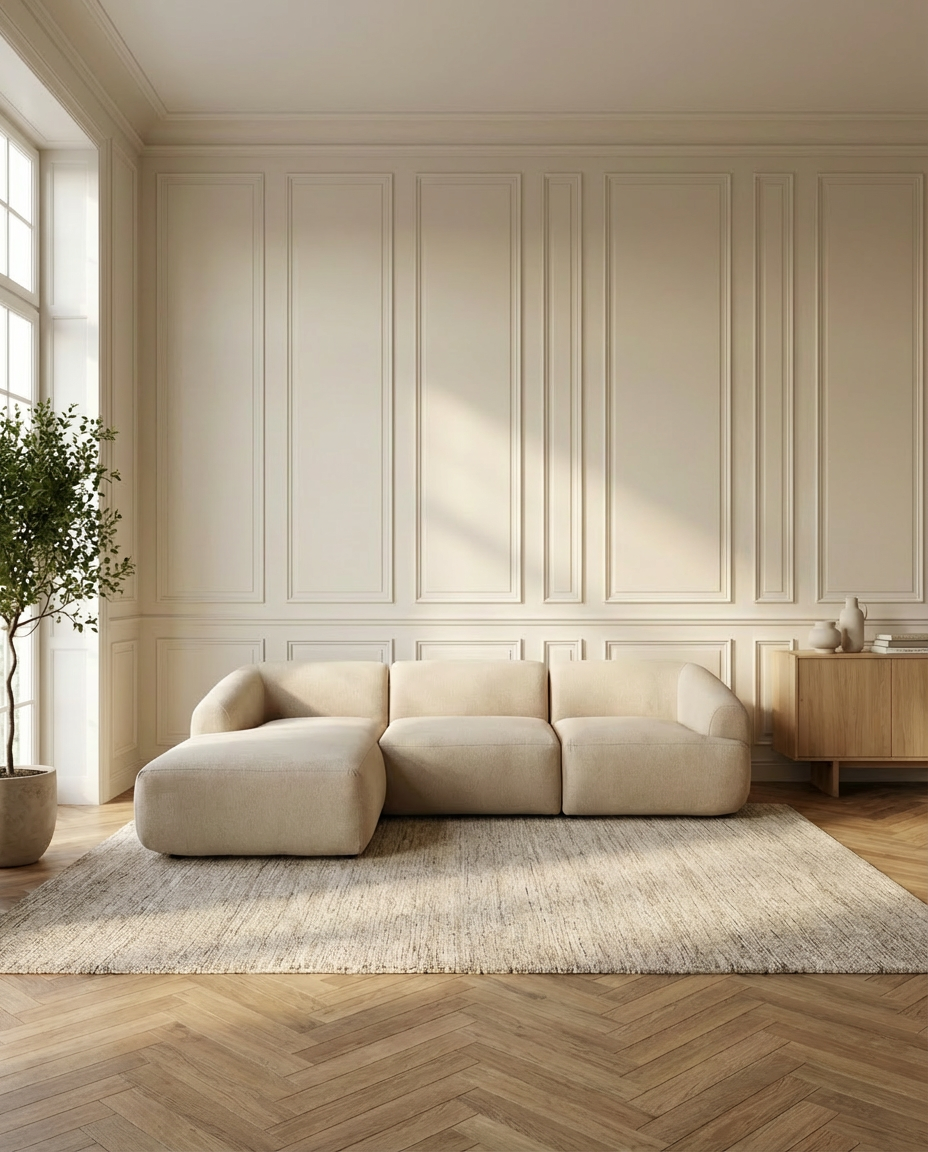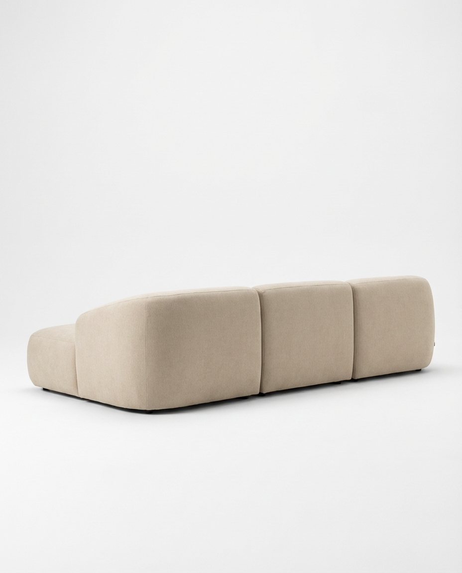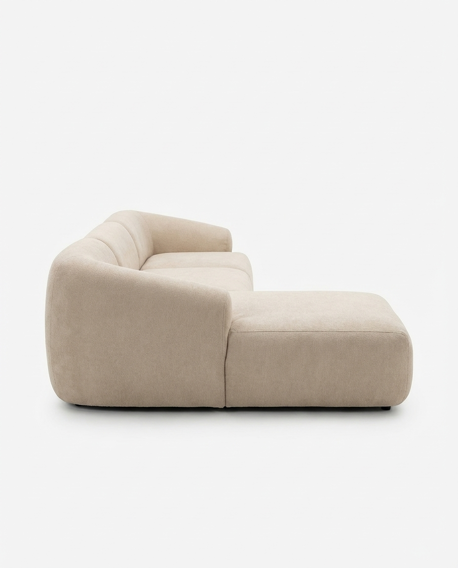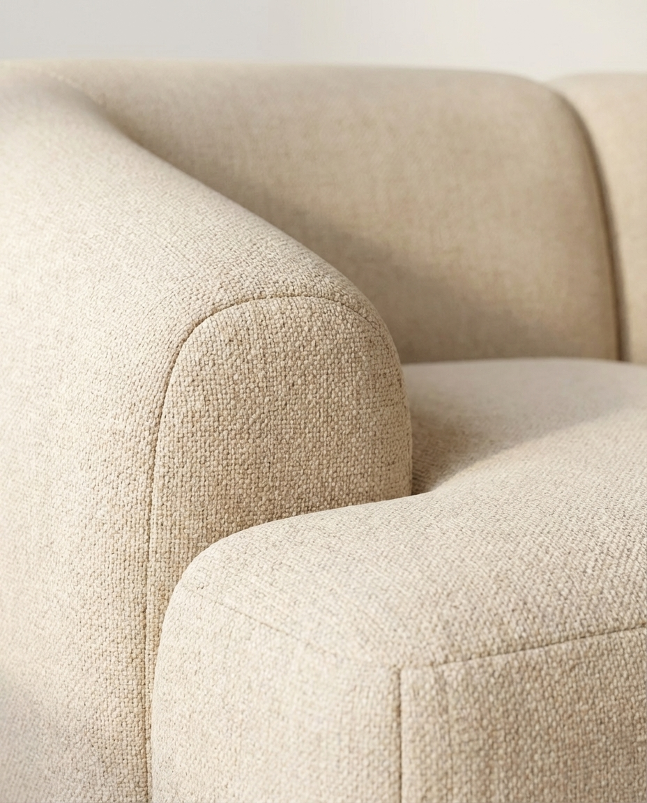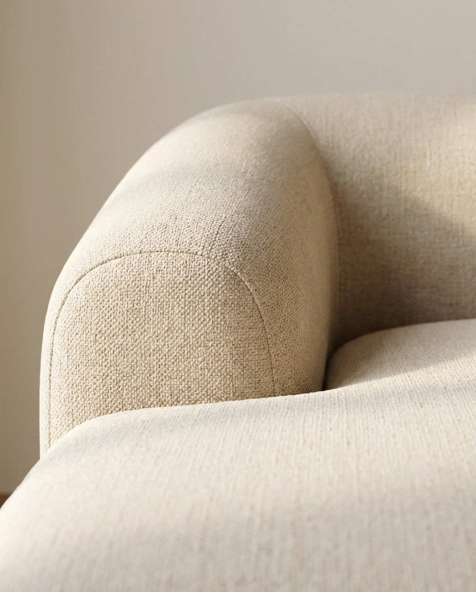 En het mooiste? Deze fauteuil is niet alleen een plaatje om te zien, maar ook een genot om in te zitten. De verhoudingen kloppen, de rondingen volgen je lichaam, en de zachte stof voelt luxe maar toch toegankelijk. Bovendien kun je ‘m volledig naar wens samenstellen – leverbaar in meerdere stoffen zoals linnen, bouclé, velvet of leer, én in verschillende houtkleuren. Zo past hij altijd perfect in jouw interieur.